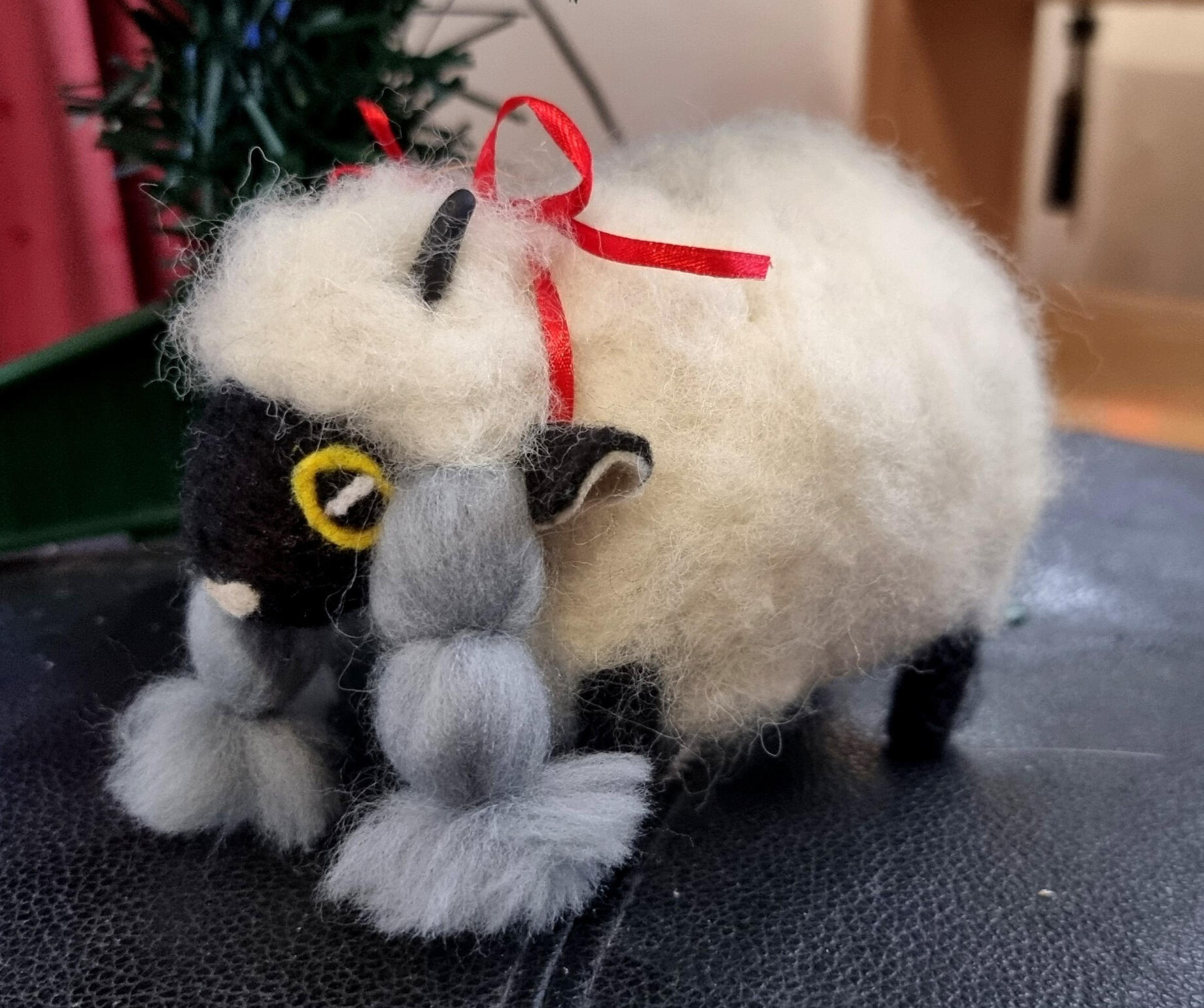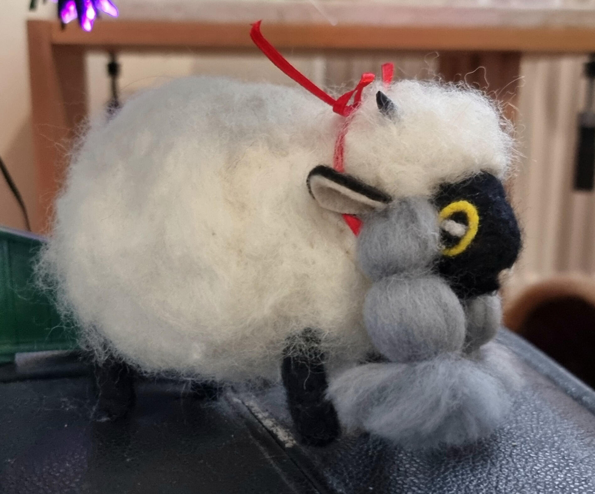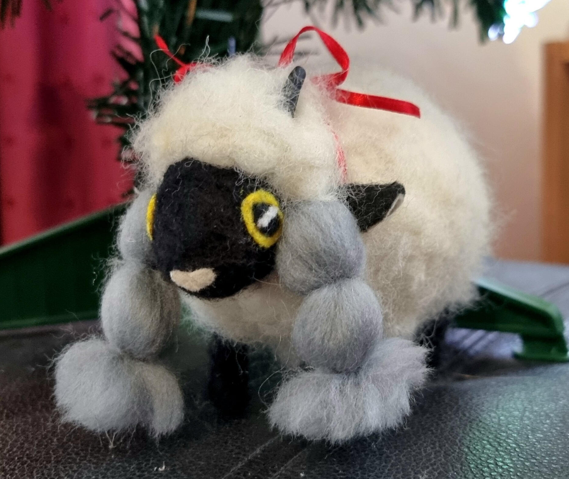The pokémon Wooloo. This sculpture was created mainly with needle felting. The horns are made with black FIMO clay and there's a wire amarture inside, making her fully posable!