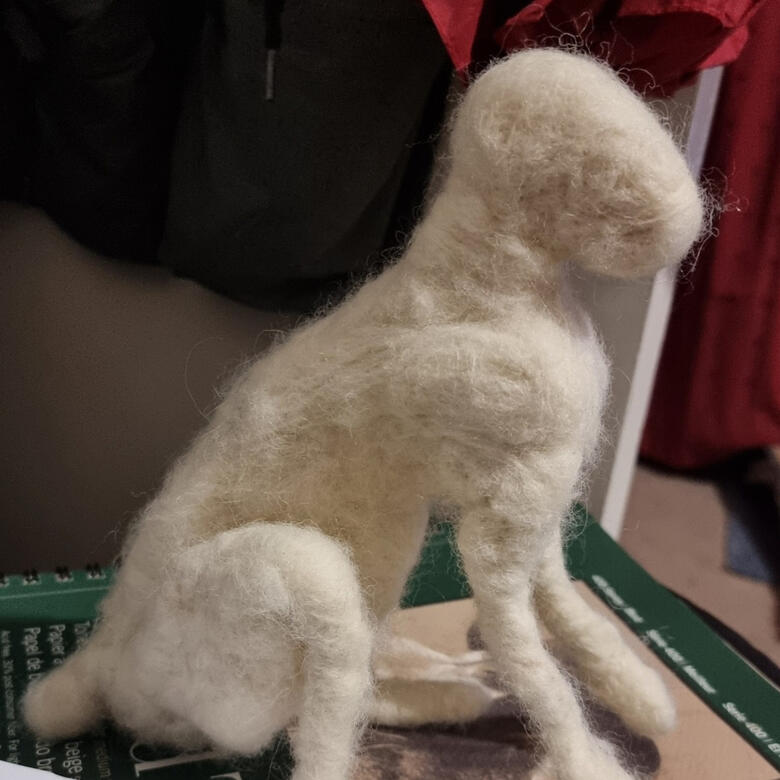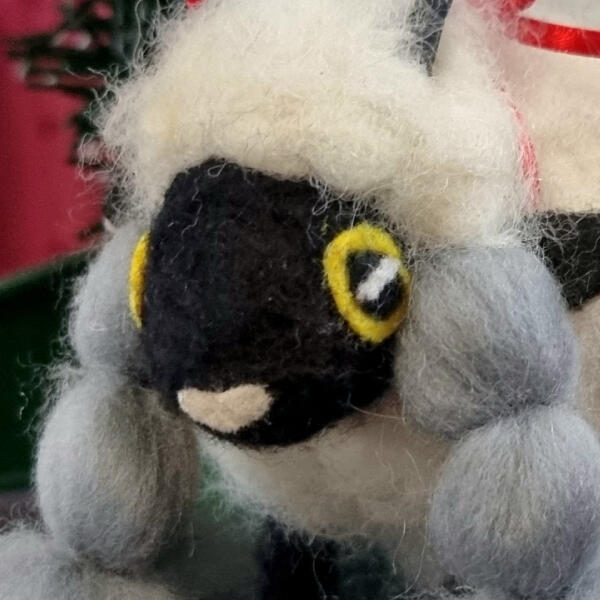 The pokémon Wooloo. This sculpture was created mainly with needle felting. The horns are made with black FIMO clay and there's a wire amarture inside, making her fully posable!