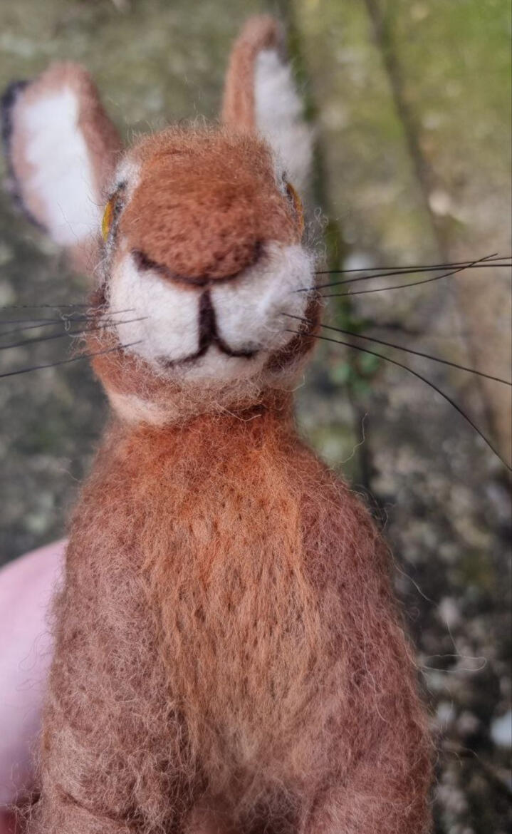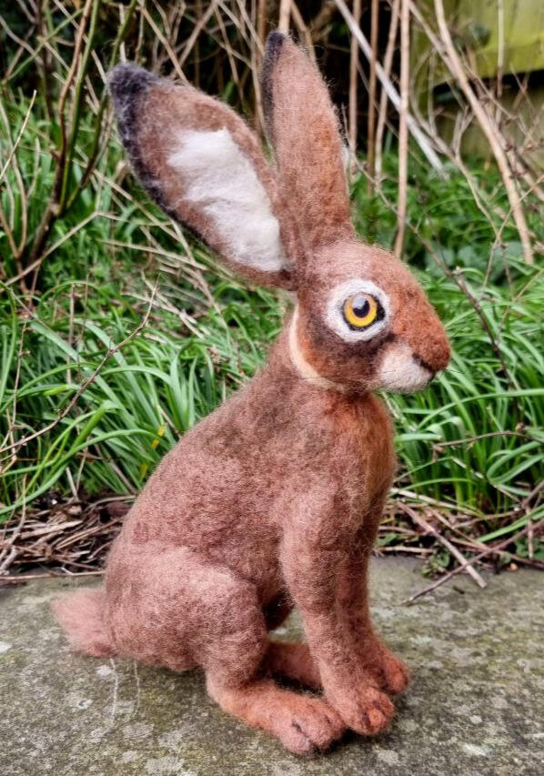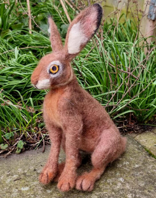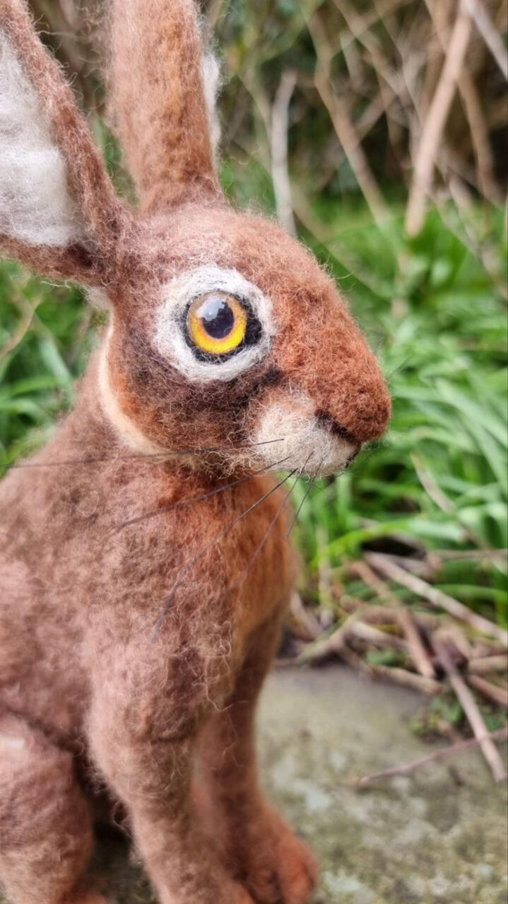 European hare, made from natural sheep wool, a wire armature, glass cabochon eyes and real horse hair whiskers.
