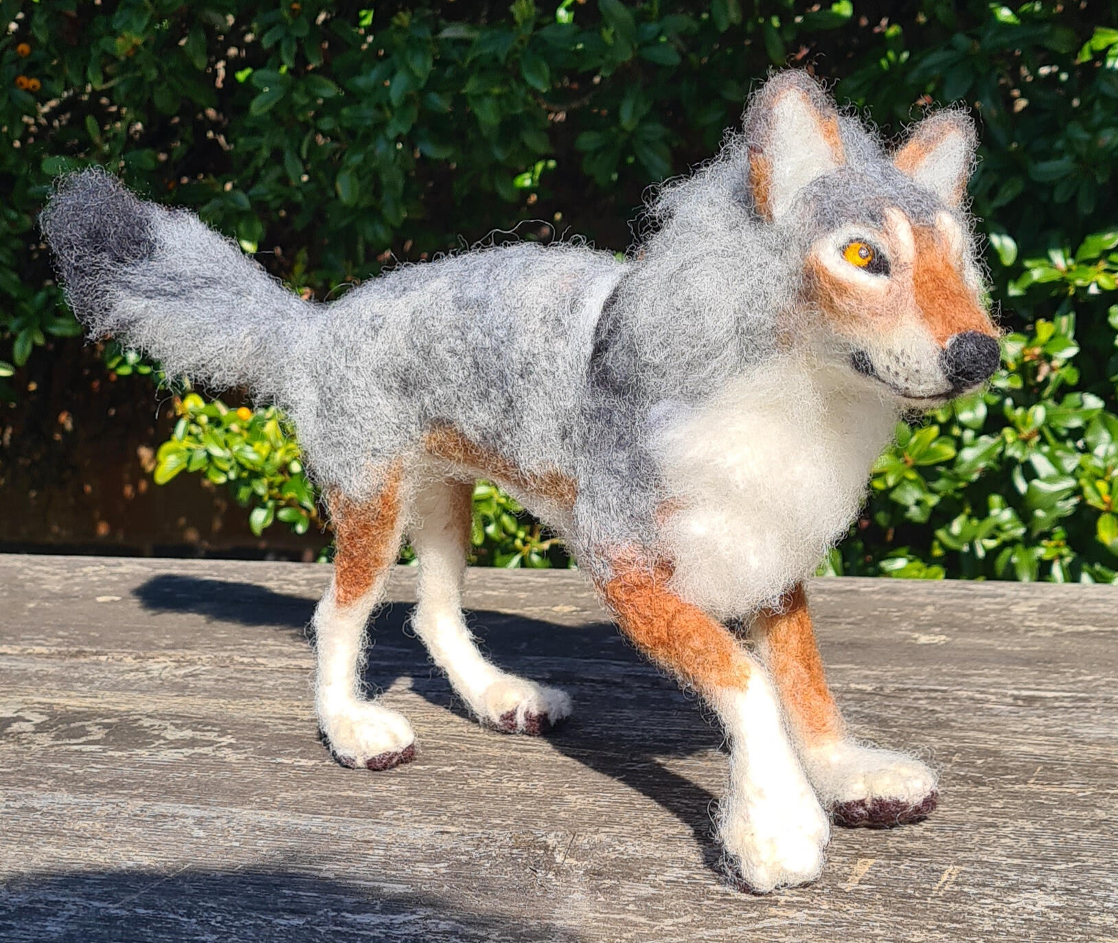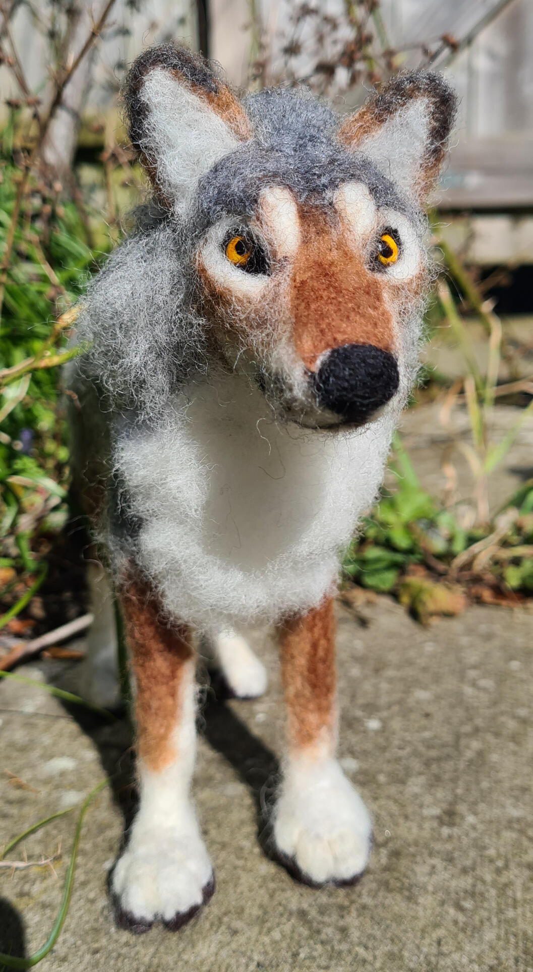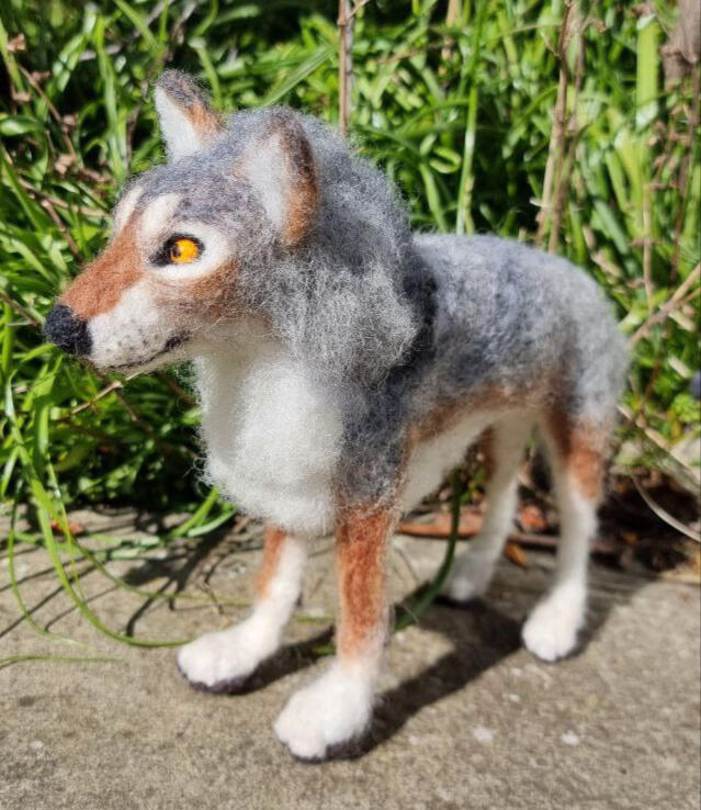 Grey wolf, made from natural sheep wool, a wire armature and painted bead eyes.